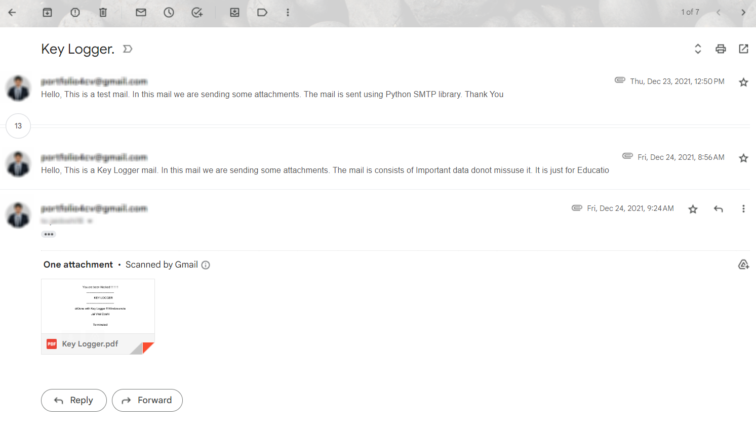 I made a key logger using Python. When someone clicks on an image on their computer, a hidden program will start running. Once it is stopped, all the things that person has typed will be sent to my email as a PDF.